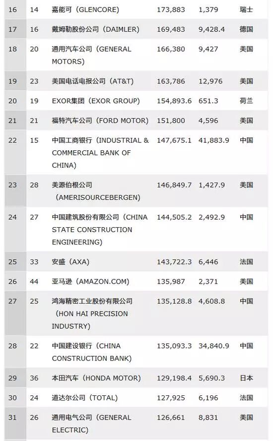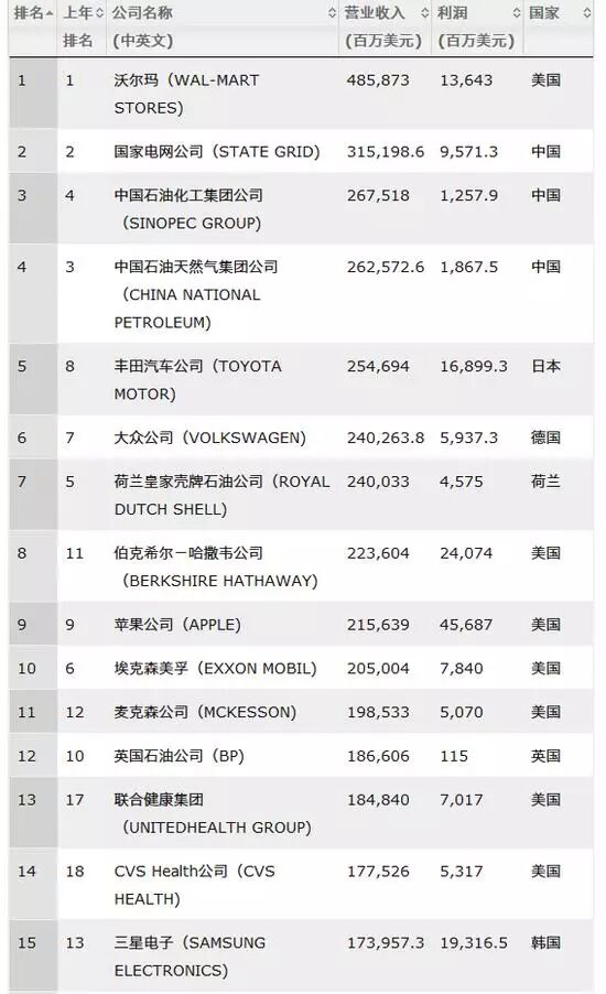 7月20日,新的《财富》世界500强排行榜出炉,沃尔玛连续四年排名第一位,前三阵营中的其它两家为中国公司——国家电网和中石化。中石油列第四位。 《财富》世界500强排行榜 《财富》世界500强排行榜一直是衡量全球大型公司的最著名、最权威的榜单,被誉为“终极榜单”,由《财富》杂志每年发布一次。去年,上榜公司的总营业收入、净利润总和以及入围门槛均有11%左右的下降。今年,这三个指标均有小幅回升,其中:上榜500家公司的总营业收入小幅增长至27.7万亿美元;净利润总和增长约3%到1.52万亿美元;入围门槛则增长了3%,回升到了216亿美元。 沃尔玛连续四年排名第一位,2016年营业收入达4,858.7亿美元,同比提升0.8%。 唯一新进入前十阵营的是沃伦·巴菲特掌管的保险和投资集团伯克希尔-哈撒韦公司。如今伯克希尔收入中近四分之三来自经营业务而非财务投资,在挣脱巴菲特光环方面又有进展。 中国五大行“霸占”利润榜 利润榜的前五名除了排在第一位的苹果公司,其余均为中国的商业银行——工商银行、建设银行、农业银行和中国银行。但对它们而言,似乎是利润和规模难以兼得,包括苹果在内的这五家公司收入均有大幅下滑。 按总资产,中国工商银行则排名第一位。在净资产收益率(ROE)榜上,中国公司中排位最高的是华为、美的、腾讯、吉利和万科。其中美的是去年第一次进入《财富》世界500强的中国家电企业,今年依然是唯一一家该行业上榜公司。执掌该公司的董事长兼总裁方洪波今年年初被《财富》(中文版)评为“年度中国商人”。 此外,员工人数最多的企业是沃尔玛和中石油,分别为230万和151万员工。去年前50家公司中跃升最快的是亚马逊,排名提升了18位。在全部去年上榜公司中跃升最快的十家公司中有三家来自中国大陆,它们是:中国五矿(上升203位)、海航集团(上升183位)和中国恒大集团(上升158位)。 中国上榜公司数量115家 中国上榜公司数量连续第十四年增长,今年达到了115家。 其中中国大陆(含香港在内,不包括台湾地区)为109家企业。 10家中国公司首次上榜,它们是:安邦保险集团、恒力集团、阳光金控、阿里巴巴、碧桂园、腾讯、苏宁云商、厦门建发集团、国贸控股集团和新疆广汇。 新上榜公司最多的行业是贸易(3家),其次是两家来自互联网服务和零售的公司——阿里巴巴和腾讯。碧桂园是唯一新上榜的房地产企业。 从其他上榜国家看,美国今年有132家公司,日本有51家。虽然中国在上榜公司数量上远远超越排在第三位的日本,但是除了金融业,该国上榜主体是10家电子和通信行业公司和10家汽车制造业公司,来自具备创新能力的优势行业;作为对比,中国除了金融业,最多的行业分布是19家能源、炼油、采矿公司和14家房地产、工程与建筑公司。不过,今年值得一提的是:随着阿里巴巴、腾讯上榜,加上去年首次上榜的京东,全球6家互联网服务大公司中国和美国各占一半。美国的三家为亚马逊、谷歌母公司Alphabet,以及今年新上榜的社交媒体巨头Facebook。 (附:2017全球财富500强前50榜单) |