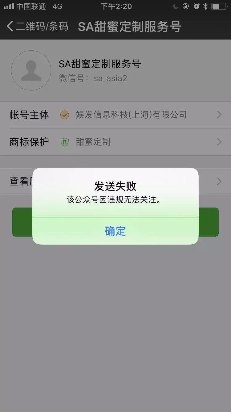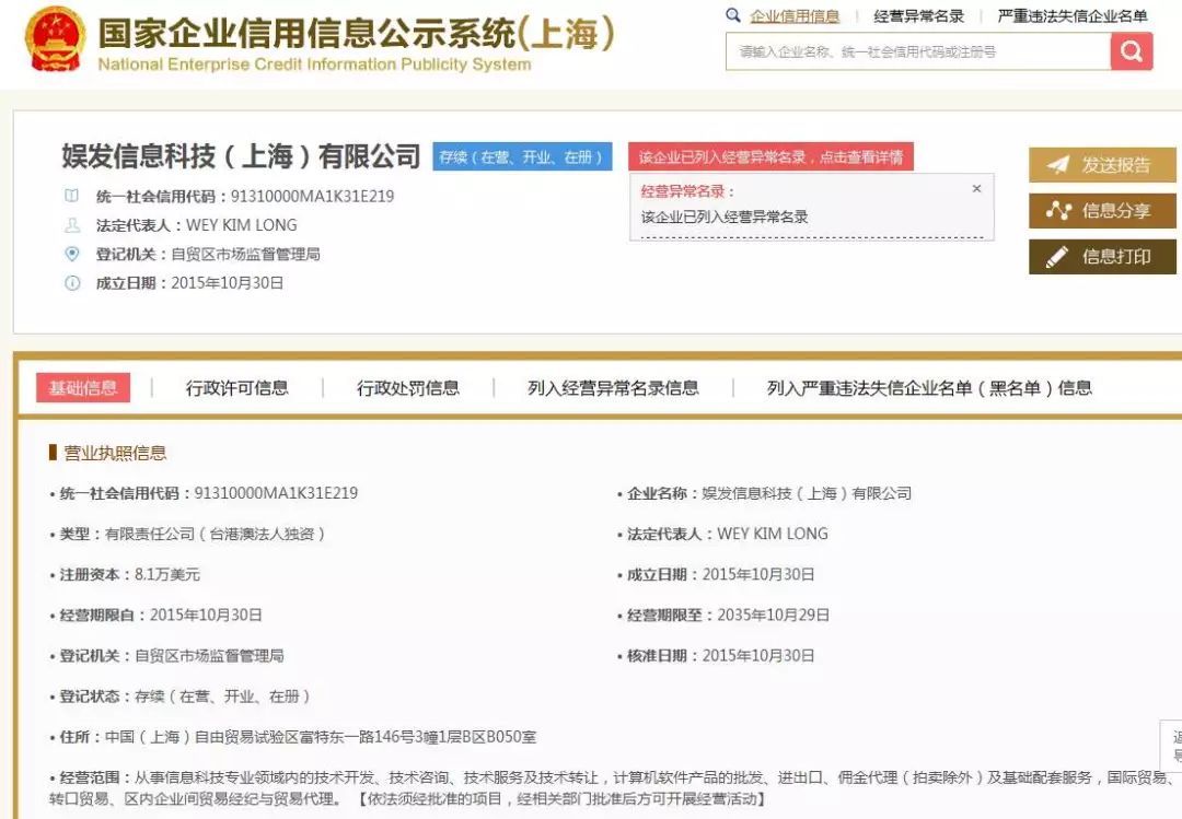 SA甜蜜定制微信公号账号主体显示为“娱发信息科技(上海)有限公司”。22日下午,红星新闻记者查询国家企业信用信息公示系统发现,因通过登记的住所或经营场所无法联系,“娱发信息科技(上海)有限公司”已被自贸区市场监督管理局列入经营异常名录。