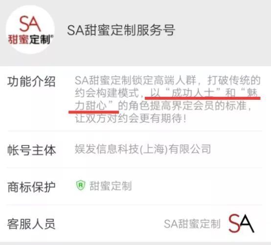 “女学生占女会员总数1/3左右” 男女比例1:4,中国活跃会员约20万 5月22日,红星新闻记者登录了SA甜蜜定制的中国官网。官网显示该平台在139个国家使用,活跃会员一千万,其中魅力甜心800万,成功人士200万,比例为4:1。 网站首页就是十张一组的漂亮女孩照片,分类为“魅力甜心”。另外还有“成功男士”、“甜心男孩”、“成功女士”三个分组。 在其官方微信公众号的简介中,甜蜜定制在境外使用的 “干爹/糖爹”和“甜心宝贝”的词语都进行了修改,变成了“高端人群”、“成功人士”和“魅力宝贝”。在网站上,对于成功人士和魅力宝贝的解读分别为“事业成功或经济基础雄厚的人士……愿意宠爱对方”、“崇尚高端品位生活,想要牵手成功富足有内涵的对方”。 英文版的文案则更加直接:“钱不是问题……只要愿意支持一个甜心宝贝”、“想要一种奢侈的生活,想要遇见一个富人”。 在甜蜜定制APP上,其类别为社交,年龄分级为17+,为频繁/强烈的成人/性暗示题材。 记者注册试验中发现,其对“成功女士(男士)”的注解为“事业稳健,经济基础雄厚”,而“魅力甜心(甜心男孩)”的注解则为“有魅力,向往结识成功人士”。 红星新闻记者看到,该平台上,有不少女性用户标注为学生。比较含蓄的交友目标是“有实力的绅士”,而更直白的则写明“希望能有资金上的帮助”,“没实力勿扰,如果你没钱”。而一些男性用户则表明,想找“16-23岁小巧玲珑的女孩”、“妩媚性感的女孩”,“寻找失去的干女儿”……这些男性用户填写的年收入都在60-100万,净资产从600万到上千万不等。 该平台在网站声明称,甜蜜定制交友平台绝非为性工作者和色情服务人员所建立,站内可疑人员的个人资料将被审查团队识别并驱逐屏蔽。 针对网上的种种批评和质疑,红星新闻记者5月22日下午与“SA甜蜜定制”大中华地区媒体负责人取得联系。 对于SA甜蜜定制是不是网友和媒体口中的“类包养网站”,以及借安排约会之名“拉皮条”的提问,该负责人表示,“包养不等于 sugar dating,sugar dating亦不等于中文版的高端婚恋交友定位。” “在中国,我们竭力将SA打造成为高端婚恋社交平台。这与国外的Sugar Dating市场定位相对独立。”该负责人称,SA的亮点是让成功牵手美丽,女性可免费使用该网站,成功男士需要升级为VIP时才能使用。 据《商业内幕》报道,SeekingArrangement曾自己公布的数据称,除了三分之一的女性用户为在校女学生外,男性用户中40%为已婚男性。 对此,其回应称:“世界范围,女学生会员大概占女会员总数1/3左右,然而在中国我们没有具体统计。跟所有的婚恋网站类似,18岁以下人群严禁加入,严禁性工作者使用本站,严禁用户利用本站做非法用途。用户资料100%要经过人工审核后才能通过。” 该负责人介绍称,世界范围内,男性会员与女性会员的比例为1:4左右。“目前中国活跃会员人数大概在20万人左右。” 官方称有关部门正在进行调查 微信公号账号主体被列入经营异常名录 SA甜蜜定制的中国官网称,该平台已获得“可信网站”行业认证已经通过网站备案信息、域名注册信息、工商登记信息、网站身份信息、网站可用性、网站安全扫描、行业资质信息等130余项审核,获得可信网站行业验证服务证书。 红星新闻看到该平台所属的公司为网发科技有限公司,该公司显示为香港企业,成立日期为2012年3月6日,为私人股份有限公司,英文名为“W8 Tech Limited”,目前负责“Seeking Arrangement”境外版APP的运营。而“W8 Tech Limited”作为大股东参股的中国内地公司为“娱发信息科技(上海)有限公司”,注册资本为8.1万美元,营业期限自2015年10月30日至2035年10月29日。注册信息显示,这家企业的类型系“台港澳法人独资”,两名公司高管分别叫WEY KIM LONG和WEY TING,而“Seeking Arrangement”的创始人Brandon Wade原名Wey Lead。 天眼查截图 该公司经营范围显示:从事信息科技专业领域内的技术开发、技术咨询、技术服务及技术转让,计算机软件产品的批发、进出口、佣金代理(拍卖除外)及基础配套服务,国际贸易、转口贸易、区内企业间贸易经纪与贸易代理。 红星新闻记者致电该公司登记留下的电话,对方开始默认自己是该公司人员,但在得知记者致电原因后又加以否认。“你们去找他们公司的人吧,我们只是注册公司。”对方说完便挂断电话。根据该公司登记的所在地为中国(上海)自由贸易试验区富特东一路146号3幢1层B区B050室,登记机关为自由贸易试验区市场监管局,红星新闻致电上海自贸区市场监督管理局,对方称由浦东新区新闻办给予回应。 浦东新区新闻办相关负责人向红星新闻记者回复称,有关部门正在对此事进行调查,但目前还没有官方结论,若有结果将适时向公众或媒体披露。 5月22日下午,甜蜜定制的微信公号因违规已无法关注。其账号主体显示为娱发信息科技(上海)有限公司。 SA甜蜜定制微信公众号因违规无法关注 同日下午,红星新闻记者查询国家企业信用信息公示系统发现,因通过登记的住所或经营场所无法联系,“娱发信息科技(上海)有限公司”已被自贸区市场监督管理局列入经营异常名录。23日下午,红星新闻记者查询发现,该企业仍然处于“列入经营异常名录”状态。 “娱发信息科技(上海)有限公司”被列入经营异常名录 甜蜜定制在华各个平台的运营,是不是就是由被列入经营异常名