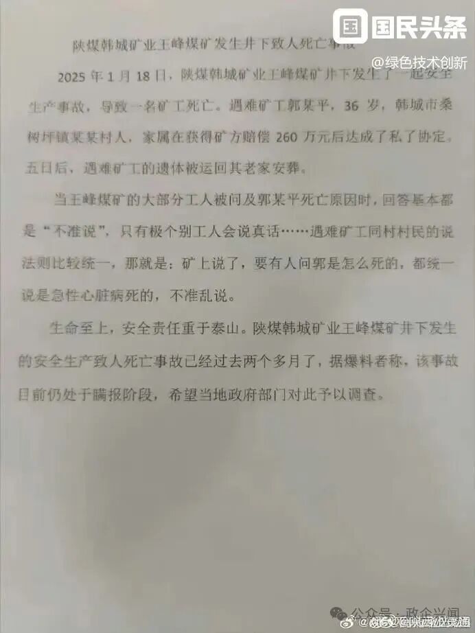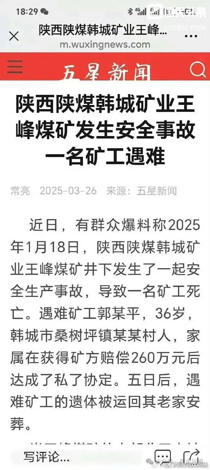 网曝陕煤韩城矿业王峰煤矿发生井下致人死亡事故,删掉帖子删不掉事实,逃过网络监督也逃不过法纪的天网。